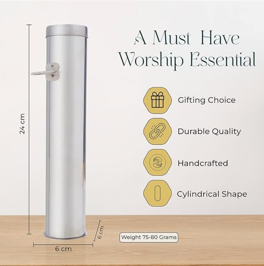 Crafted from durable stainless steel, this agarbatti storage container keeps your incense sticks protected from moisture, dust, and damage. The sleek cylindrical design fits easily into pooja shelves and cupboards. The lid ensures freshness while the container itself enhances your sacred rituals with a clutter-free, organized touch.