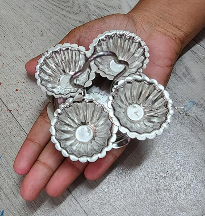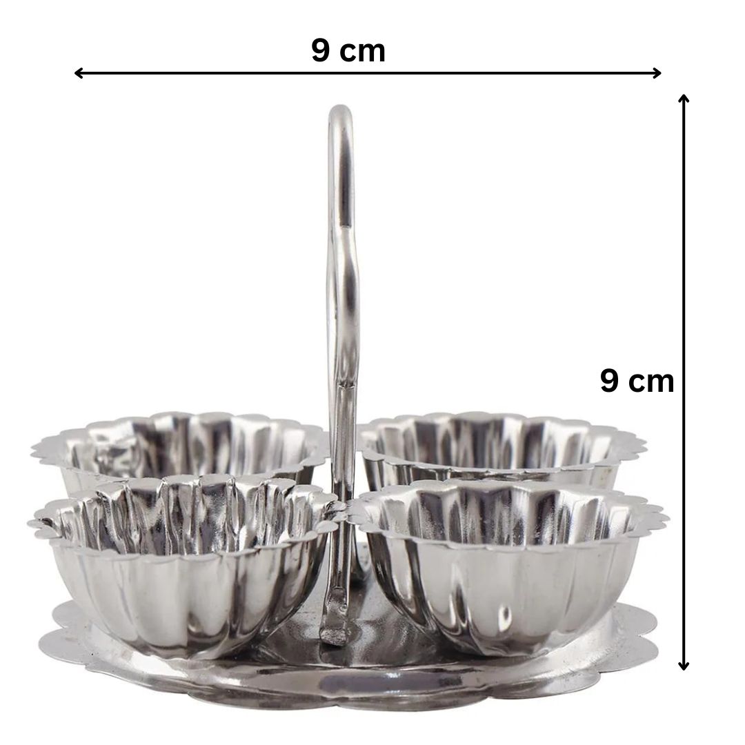 This traditional stainless steel chowmukh kankavati is used to store and present pooja essentials like haldi, kumkum, akshata (rice), and chandan during religious ceremonies. The multi-compartment design is practical, compact, and rooted in Indian culture, making it a spiritual essential in every home temple or pooja setting. Ideal for festivals, weddings, housewarming functions, and daily pooja use.
